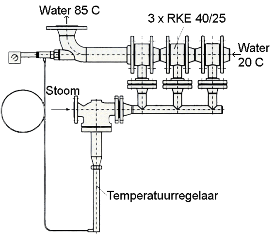 Une quantité d'eau de 6000 litre/heure est chauffée de 20°C à 90°C par 3 injecteurs de vapeur de type RKE 40/25 connectés avec une capacité de vapeur de 3x280 kg/h = 840 kg/h. Lors de l’utilisation de plusieurs injecteurs, un Δt ou réchauffement de l'eau important
